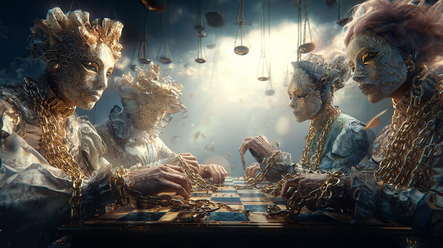 The chain weighs down in golden power for a myth that speaks of righteousness, while being nothing but.
